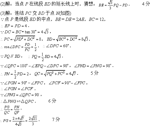 (3)µ±µãPÔ˶¯µ½Ïß¶ÎEDµÄÖеãʱ(Èçͼ)£¬Á¬½áQC£¬¹ýµãP×÷PF¡ÍQC£¬´¹×ãΪF£¬PF½»BDÓÚµãG£®ÈôBC£½12£¬ÇóÏß¶ÎPGµÄ³¤£®
