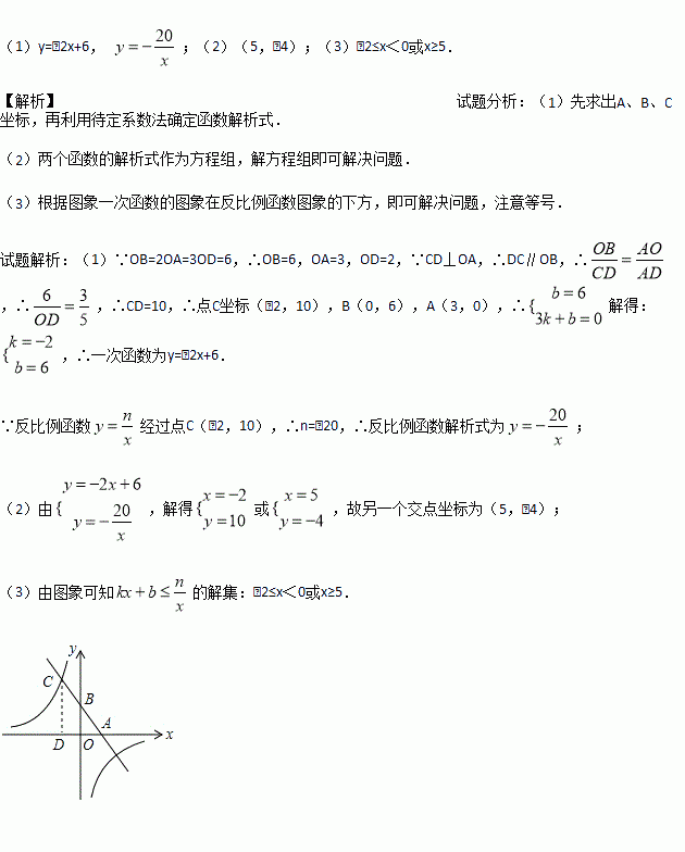 (n为常数且n≠0)的图象在第二象限交于点C.CD⊥x轴,垂直为D,若OB=2OA=3OD=6.