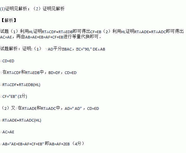 如图所示,在△ABC中,∠C=90°,AD是∠BAC的平分线,DE⊥AB交AB于E,F在AC上,BD=DF.求证:(1)CF=EB;(2)AB=AF+2EB.