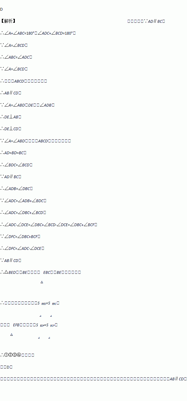 如图,已知四边形ABCD中,AD∥BC,∠A=∠BCD=∠ABD,DE平分∠ADB,下列说法:①AB∥CD;②ED⊥CD;③∠DFC=∠ADC﹣∠DCE;④S△EDF=S△BCF,其中正确的结论是( )