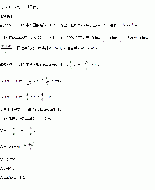 (1)观察上述等式,猜想:在Rt△ABC中,∠C=90°,都有sin2A+sin2B= .