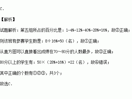 某班将安全知识竞赛成绩整理后绘制成直方图,图中从左至右前四组的百分比分别是4%,12%,40%,28%,第五组的频数是8.则:① 该班有50名同学参赛;② 第五组的百分比为16%;③ 成绩在70~80分的人数最多;④ 80分以上的学生有14名,其中正确的个数有( )