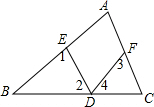分析 根据等腰三角形的性质可求得∠1=∠2∠3=∠4,再结合三角形内角和定理,可用∠B和∠C分别表示出∠2和∠4,结合平角的定义,可找到∠2+∠EDF+∠4=180°,可求得∠EDF的大小.