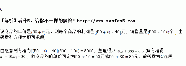 将进货单价为40元的商品按50元出售时,就能卖出500个.已知这种商品每个涨价1元,其销售量就减少10个,为了赚得8000元的利润,商品售价应为( )