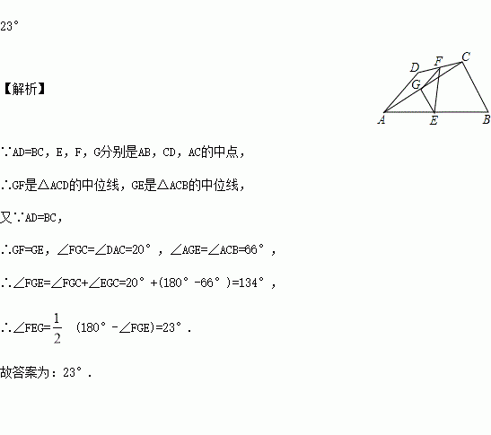 如图所示,在四边形 ABCD中,AD=BC,E,F,G分别是AB,CD,AC的中点.若∠DAC=20°,∠ACB=66°,则∠FEG等于________。