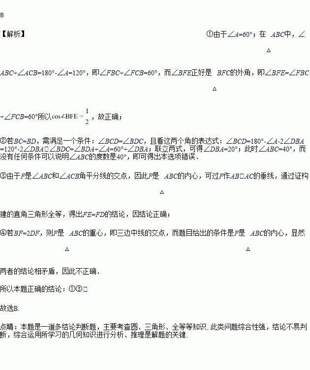 如图,△ABC内接于⊙O,∠A的度数为60°,∠ABC、∠ACB的角平分线分别交于AC、AB于点D、E,CE、BD相交于点F.以下四个结论:①