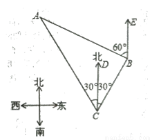 (10分)如图,我国渔政船在钓鱼岛海域C处测得钓鱼岛A在渔政船的北偏西30。的方向上,随后渔政船以80海里/小时的速度向北偏东30°的方向航行,半小时后到达B处,此时又测得钓鱼岛A在渔政船的北偏西60°的方向上,求此时渔政船距钓鱼岛A的距离姓B.(结果保留小数点后一位,其中