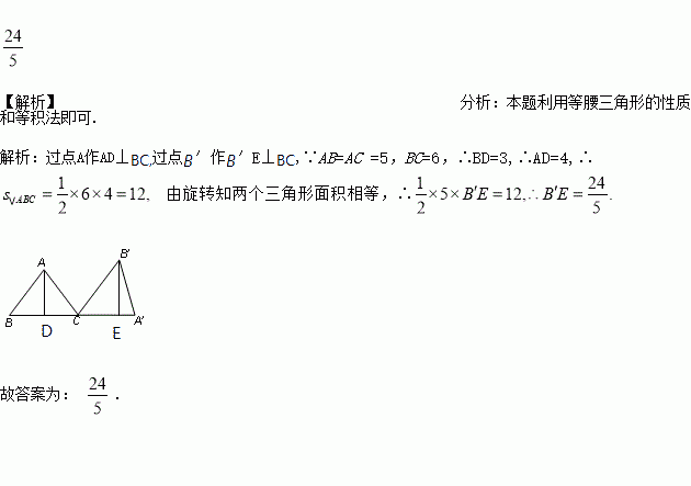 如图,在△ABC中,AB=AC =5,BC=6,将△ABC绕点C顺时针方向旋转一定角度后得到△A′B′C,若点A′恰好落在BC的延长线上,则点B′到BA′的距离为__________.
