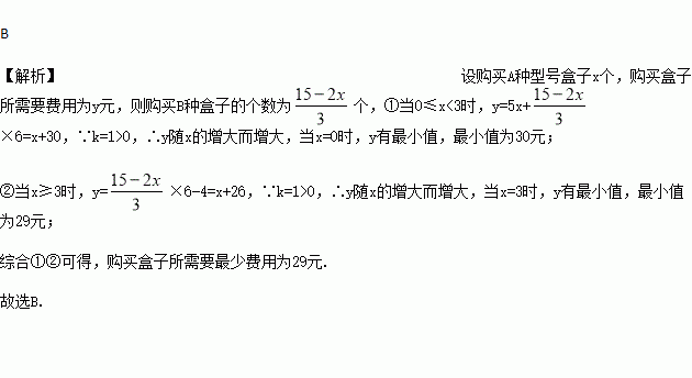 一食堂需要购买盒子存放食物,盒子有A、B两种型号,单个盒子的容量和价格如下表.现有15升食物需要存放且要求每个盒子要装满,由于A型号盒子正做促销活动:购买三个及三个以上可一次性返还现金4元,则购买盒子所需最少费用是( )