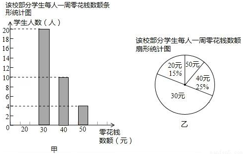 为了了解学生零花钱的使用情况,校团委随机调查了本校部分学生每人一周的零花钱数额,并绘制了如图甲、乙所示的两个统计图(部分未完成).请根据图中信息,回答下列问题: