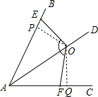 分析 作OP⊥AB于P,OQ⊥AC于Q,根据四边形内角和等于360°得到∠AEO+∠AFO=180°,得到∠OEP=∠OFQ,根据角平分线的性质得到OP=OQ,证明△OEP≌△OFQ,根据全等三角形的性质得到答案.