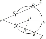 分析 (1)由PG平分∠EPF可得∠CPO=∠APO,由AO∥PD可得∠CPO=∠AOP,从而有∠APO=∠AOP,则有AP=AO.
