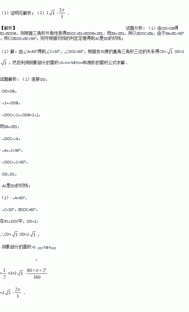 (2)若∠A=60°,⊙O的半径为2,求阴影部分的面积.(结果保留根号和π)