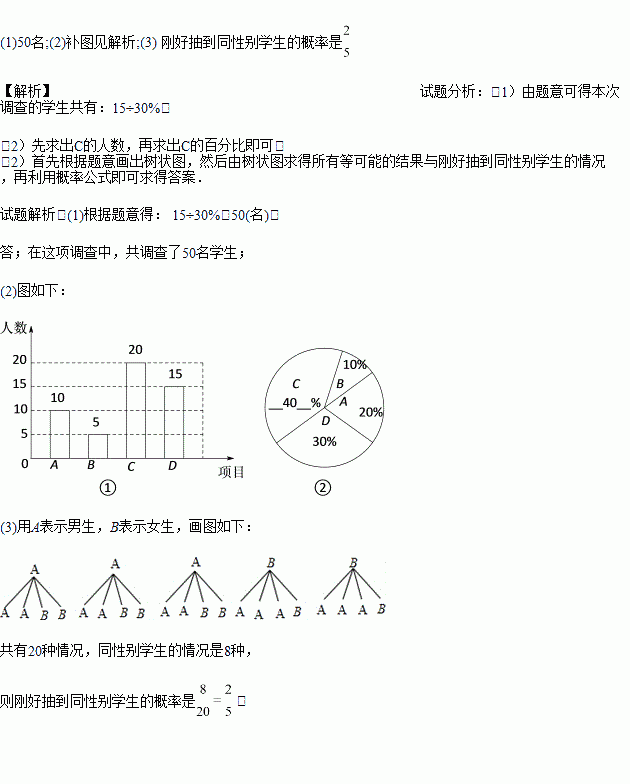 (3)若调查到喜欢“立定跳远”的5名学生中有3名男生,2名女生.现从这5名学生中任意抽取2名学生.请用画树状图或列表的方法,求出刚好抽到同性别学生的概率.