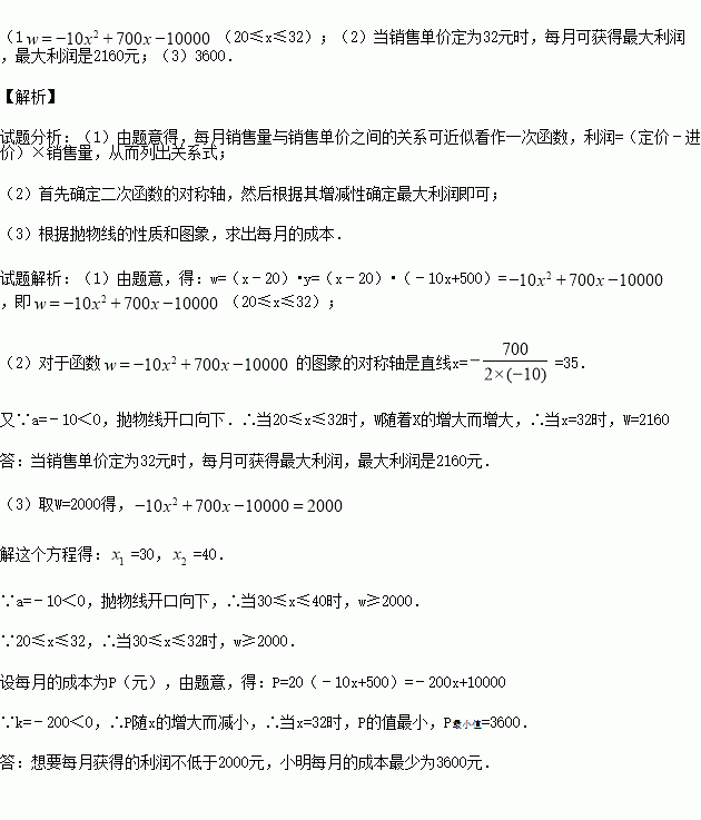 (3)如果小明想要每月获得的利润不低于2000元,那么小明每月的成本最少需要多少元?(成本=进价×销售量)