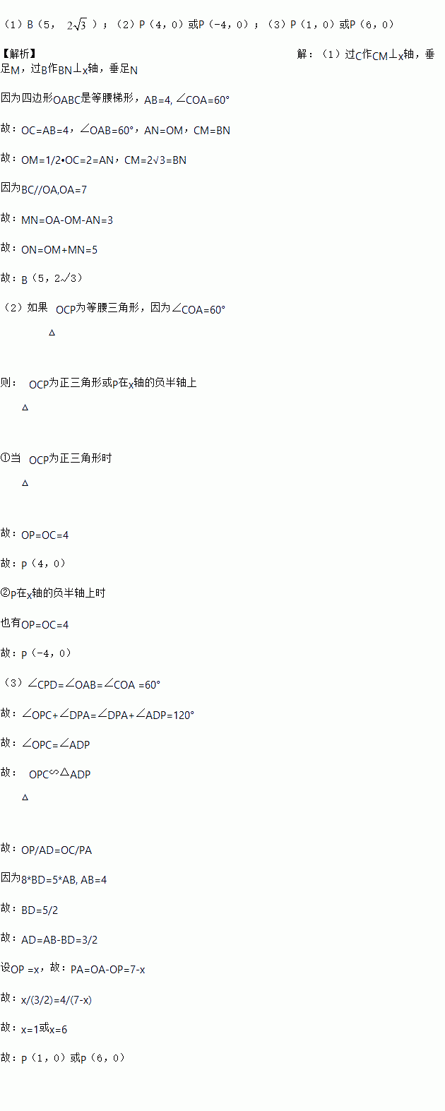 如图,在平面直角坐标系中,四边形OABC是等腰梯形,BC∥OA,OA=7,AB=4,∠ COA=60°,点P为x轴上的—个动点,点P不与点O、点A重合.连结CP,过点P作PD交AB于点D.