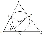 分析 如图所示;连接OD,OF.首先利用三角形内角和定理求出∠A=50°,再运用切线的性质得到OD⊥AB,OF⊥AC,又因为,∠A=50°,根据四边形内角和定理,得出∠DOF=130°,再根据圆周角定理得出∠DMF=65°.