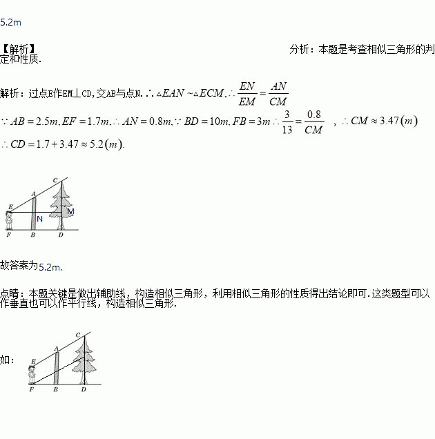 如图,直立在点B处的标杆AB=2.5m,站立在点F处的观测者从点E看到标杆顶A,树顶C在同一直线上(点F,B,D也在同一直线上).已知BD=10m,FB=3m,人的高度EF=1.7 m,则树高DC是________.(精确到0.1 m)