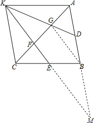 分析 首先延长KE、AB相交于M,连接BG,根据D,E分别为AB,BC上的中点,F,G为AC的三等分点可得$\frac{KG}{DG}$=$\frac{CG}{AG}$,然后可证出△CKG∽△ADG,根据相似三角形的性质可得∠DAG=∠KCG,$\frac{KC}{AD}=\frac{KG}{DG}$=2,进而可得KC∥AB,KC=2AD=AB,根据一组对边平行且相等的四边形是平行四边形可得结论.