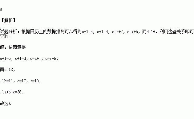 (2015秋•陕西校级期末)在某月的日历上用矩形圈到a、b、c、d四个数(如图),如果d=18,那么a+b+c=( )