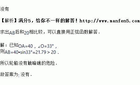 海里水域有暗礁,如果不改变航向,轮船________(填“有”或“没有”)触暗礁的危险.(可使用科学记算器)![]()