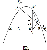 (3)过点F作FH⊥MN于H,如图2.在(2)的条件下,可求出S△QOB,从而可求出MN的值.易证△DFN∽△COB,设DF=2m,根据相似三角形的性质及勾股定理可求出FN、DN、MF、FH、MH、DH、MD的值,从而得到MD=DN=4.设点M的横坐标为n,可得到MD=-$\frac{2}{9}$n2+2n=4,然后解这个方程,就可得到点M的坐标,根据MN=8就可得到点N的坐标.