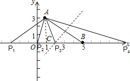 分析 过A作AC⊥x轴于C,根据A(1,3),B(5,0),得到AC=3,BC=4,根据勾股定理得到AB=$\sqrt{A{C}^{2}+B{C}^{2}}$=5,①若AP=AB=5,则PC=BC=4,求得 P1(-3,0);②若BP=BA=5,求得P2(0,0);③若PA=PB,则P在AB的垂直平分线上,求得P3($\frac{25}{8}$,0);④若BA=PB=5,求得P4(10,0).