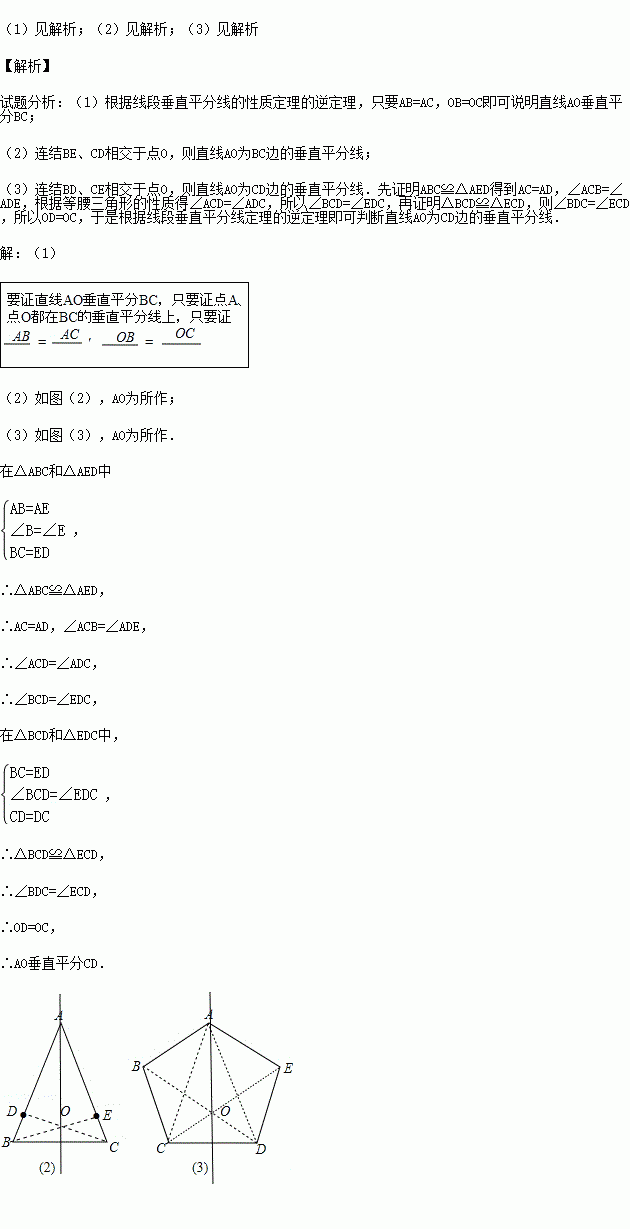 (3)如图(3),在五边形ABCDE中,AB=AE,BC=DE,∠B=∠E,请你只用无刻度的直尺画出CD边的垂直平分线,并说明理由.