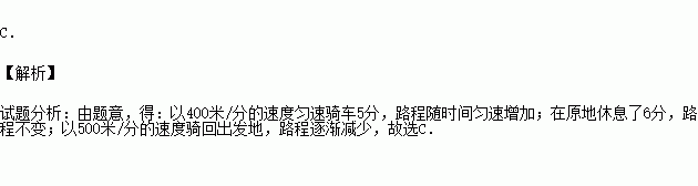 小刚以400米/分的速度匀速骑车5分,在原地休息了6分,然后以500米/分的速度骑回出发地.下列函数图象能表达这一过程的是( )