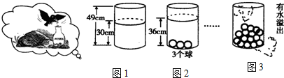 从图1、图2给出的信息可得在量筒中放入放小球个数x=3时水面高y是36cm;