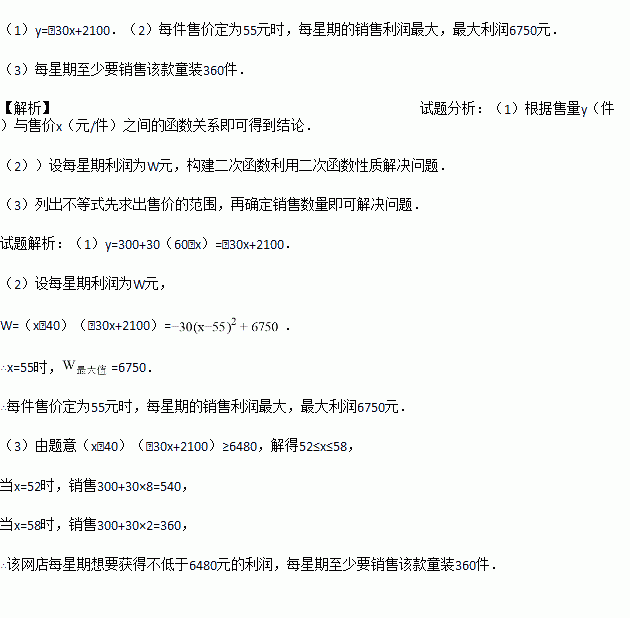 (3)若该网店每星期想要获得不低于6480元的利润,每星期至少要销售该款童装多少件?