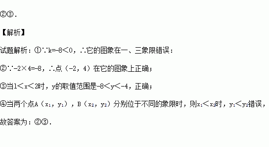 ③当1<x<2时,y的取值范围是-8<y<-4;