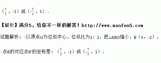 在平面直角坐标系中,点A(2,3),B(5,﹣2),以原点O为位似中心,位似比为1:2,把△ABO缩小,则点B的对应点B′的坐标是_______.