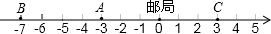 解答 解:(1)如图:(2)3-(-3)=6(千米).答:C村离A村有6千米.(3)3+4+10+3=20(千米).答:邮递员一共骑行了20千米.