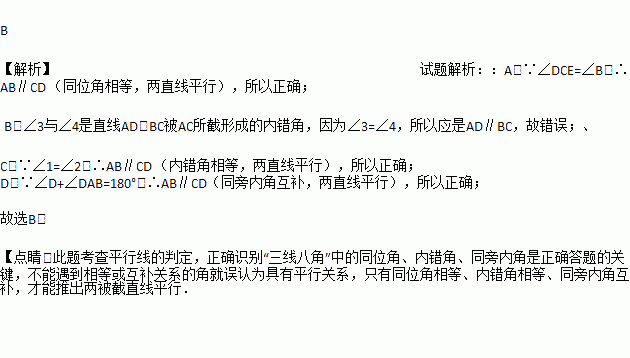 A. ∠B=∠DCE B. ∠3=∠4
