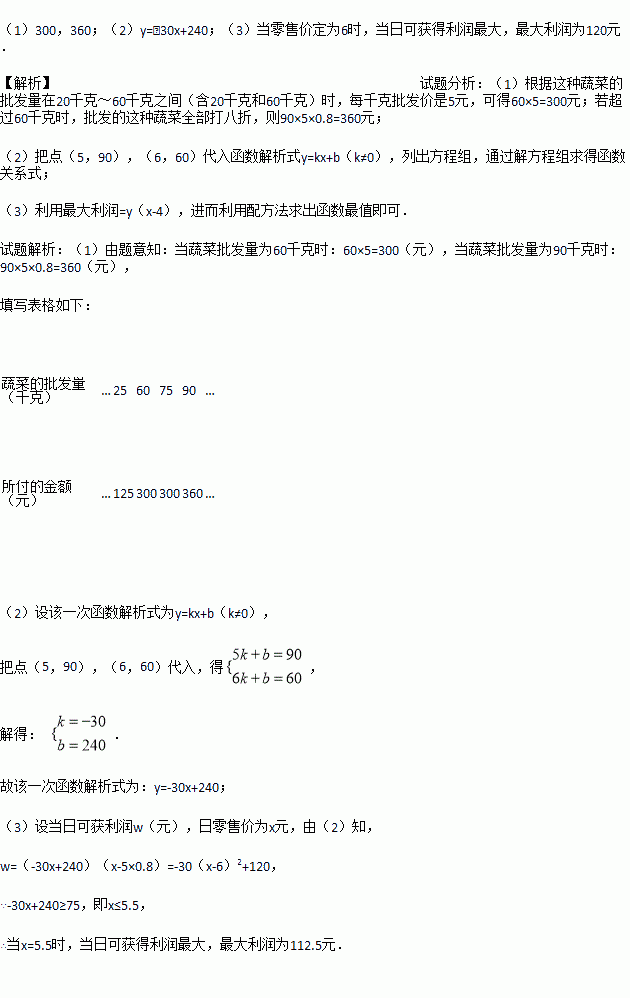 (12分)某蔬菜经销商去蔬菜生产基地批发某种蔬菜,已知这种蔬菜的批发量在20千克~60千克之间(含20千克和60千克)时,每千克批发价是5元;若超过60千克时,批发的这种蔬菜全部打八折,但批发总金额不得少于300元.