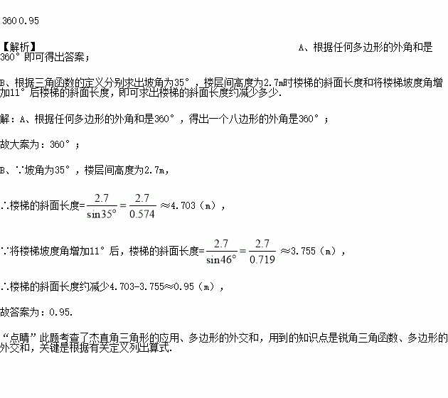 B.计划在楼层间修建一个坡角为35°的楼梯,若楼层间高度为2.7m,为了节省成本,现要将楼梯坡角增加11°,则楼梯的斜面长度约减少__m.(用科学计算器计算,结果精确到0.01m)