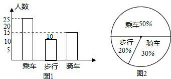 (2)“步行”的人数为:50-25-15=10(人),补全图形如图:![]()