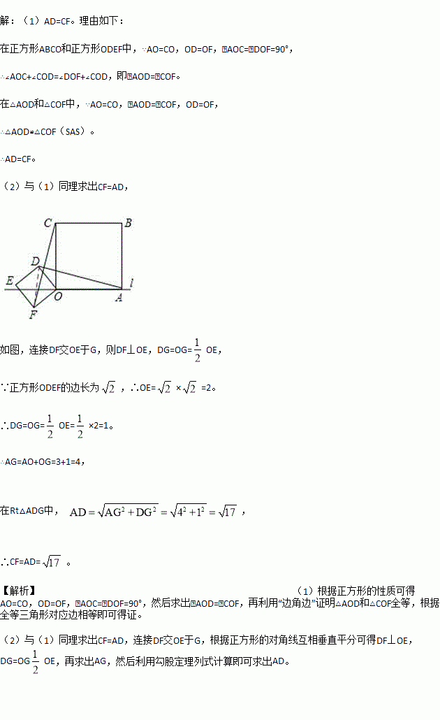 (1)他将正方形ODEF绕O点逆时针针旋转一定的角度,如图b,试判断AD与CF还相等吗?说明理由.