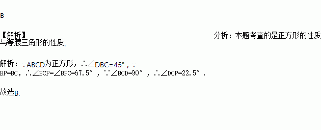 如图,已知P是正方形ABCD 对角线BD上一点,且BP=BC,则∠DCP的度数是( )