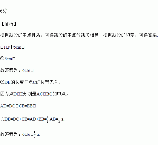 (1)如图,已知AB=12cm,点C为线段AB上的一个动点,D、E分别是AC、BC的中点;①若点C恰为AB的中点,则DE=_______cm;②若AC=4cm,则DE=________cm;