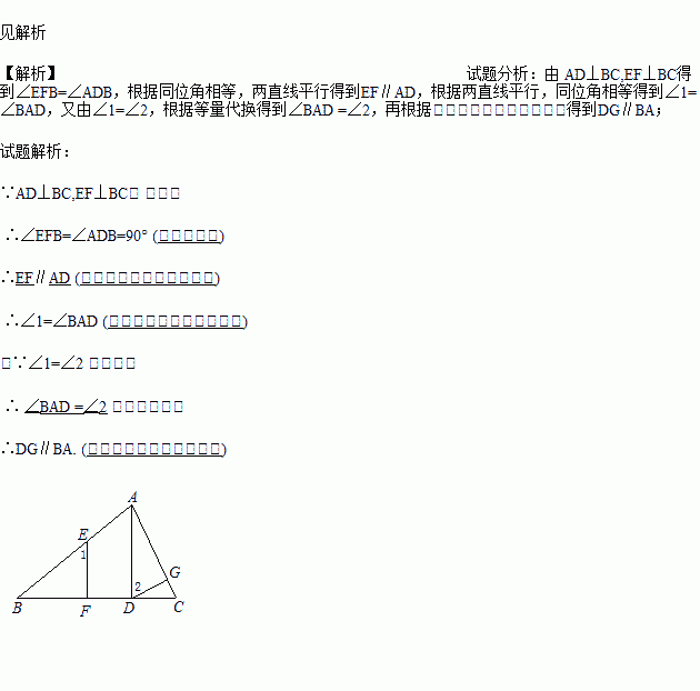 完成下列填空.如右图,已知AD⊥BC,EF⊥BC,∠1=∠2. 求证: DG∥BA.