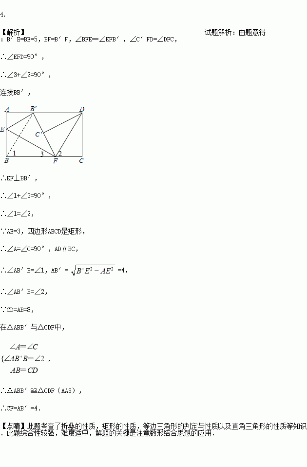 如图,将矩形纸片的两个直角分别沿EF、DF翻折,点B恰好落在AD边上的点B′处,点C恰好落在边B′F上.若AE=3,BE=5,则FC=______.