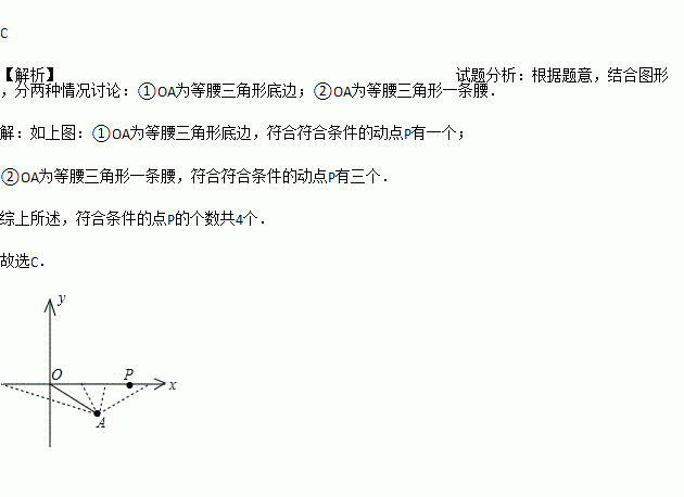 如图,坐标平面内一点A(2,-1),O是原点,P是x轴上一个动点,如果以点P、O、A为顶点的等腰三角形,那么符合条件的动点P的个数为( )