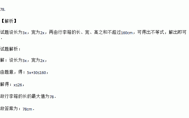 铁路部门规定旅客免费携带行李箱的长宽高之和不超过160cm,某厂家生产符合该规定的行李箱,已知行李箱的高为30cm,长与宽之比为3:2,则该行李箱长度的最大值是 cm.