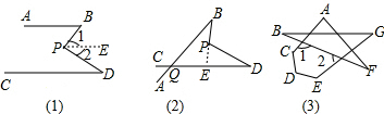 分析 (1)过P作PE∥AB,根据平行线的性质可求得∠BPD=∠B+∠D;