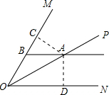 分析 过A作AC⊥OM,AD⊥ON,由OP为角平分线,利用角平分线定理得到AC=AD,AD即为直线AB与ON之间的距离,由BA与ON平行得到一对内错角相等,再由角平分线得到一对角相等,等量代换得到一对角相等,再利用外角性质及直角三角形的性质得到∠BAC=30°,利用30度角所对的直角边等于斜边的一半求出BC的长,利用勾股定理求出AC的长,即为AD的长.