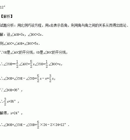 (2015秋•日照期末)已知:如图所示,∠AOB:∠BOC=3:2,OD平分∠BOC,OE平分∠AOC,且∠DOE=36°,求∠BOE的度数.