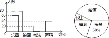 (2)由(1)中数据将条形统计图补充完整;用绘画和舞蹈小组部人数与总人数的百分比,再乘以360度即可求出扇形统计图中的绘画和舞蹈小组部分的圆心角的度数.