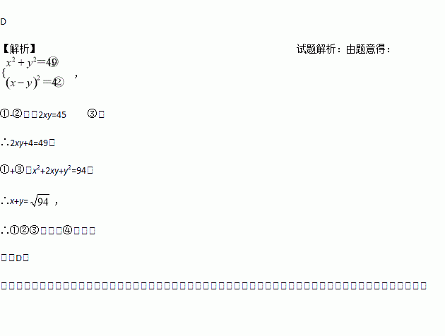 如图,是4个全等的直角三角形镶嵌而成的正方形图案,已知大正方形的面积为49,小正方形的面积为4,若用x,y表示直角三角形的两条直角边(x > y),请观察图案,指出下列关系式不正确的是( )